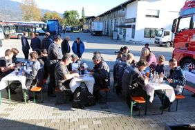 Die Belegschaft von MAN kam zum Weißwurstfrühstück und brauchte dazu nur ein paar Schritte zurücklegen. Im Hintergrund ist die MAN-Werkstatt zu sehen.