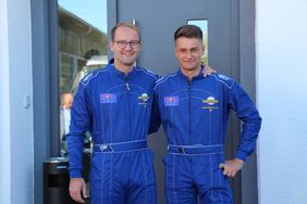 Die Europameister Jan Plieninger und Marc Stegmaier vor der BFS-Niederlassung Garmisch-Partenkirchen.
