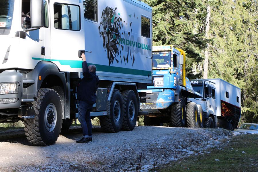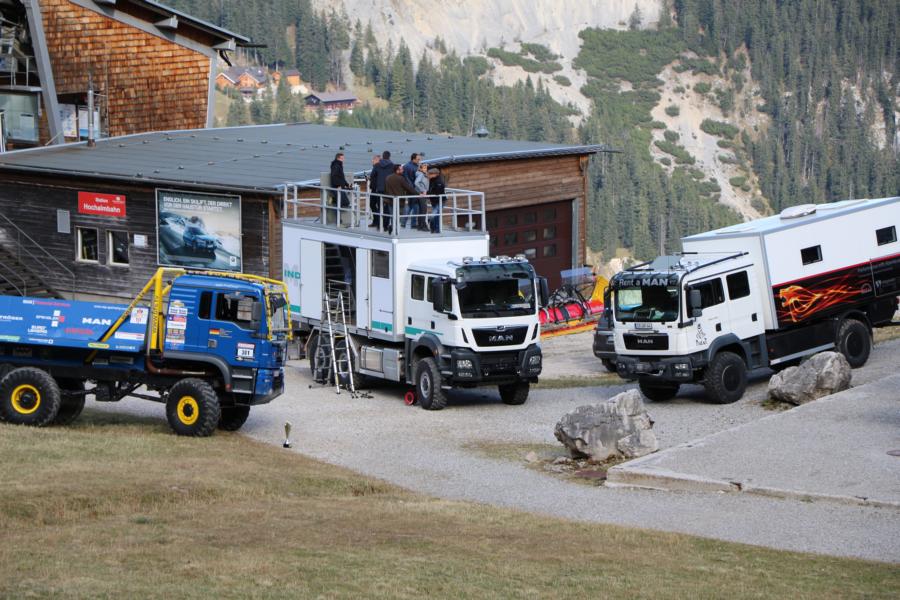 Drei MAN auf der Hochalm, darunter der blaue EM-Truck.