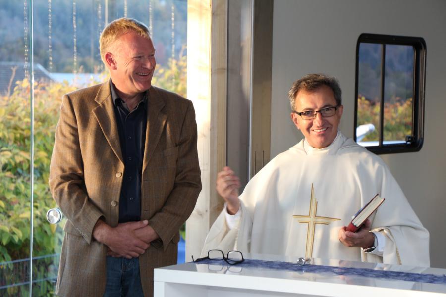 Andreas Boos, BFS-Niederlassungsleiter in Garmisch-Partenkirchen, und Pfarrer Josef Konitzer, der das neue BFS-Domizil segnete.